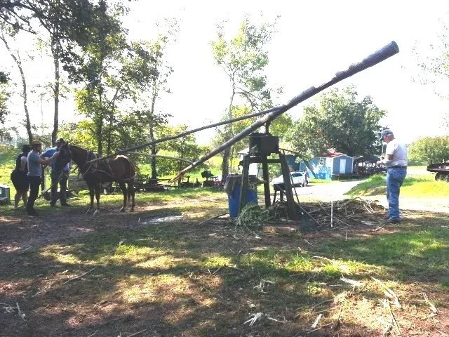 Sugar Cane being pressed for juice at Muddy Pond Sorghum Mill, Montery, TN. Photo: Amy Campbell. https://www.muddypondsorghum.com/